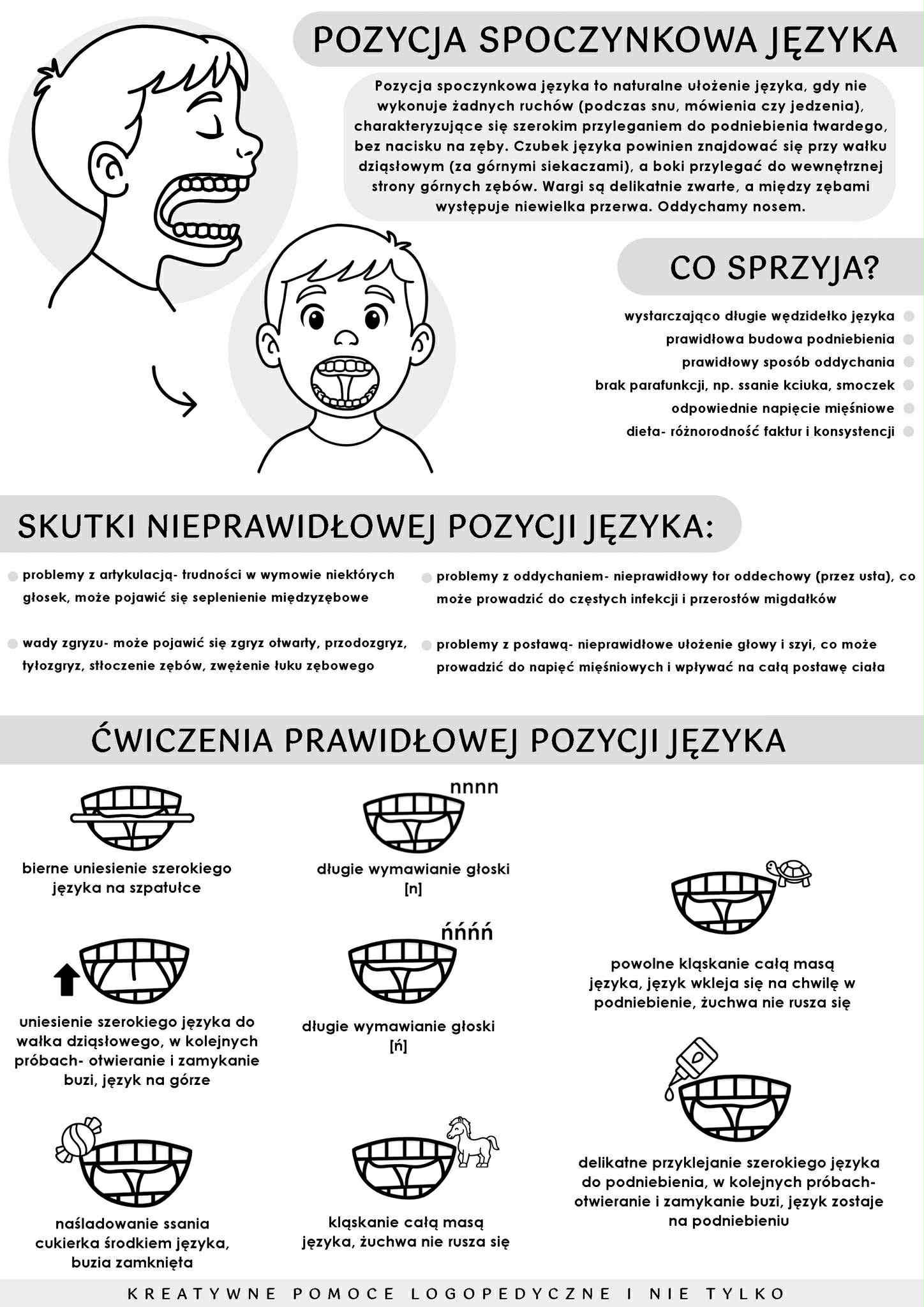 (przesuwamy językiem po zewnętrznej stronie zębów) i w środku (przesuwamy językiem po wewnętrznej stronie zębów) i uprać firanki (parskanie wargami). To już prawie wszystko! Został nam tylko stych i piwnica (kierujemy na zmianę język na brodę i w stronę nosa). Uff! Dom już posprzątany! Teraz możemy z uśmiechem podziwiać efekty naszej pracy! (szeroko się uśmiechamy, robimy na zmianę kilka razy uśmiech i zdziwioną minę).